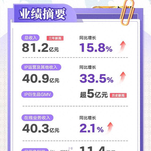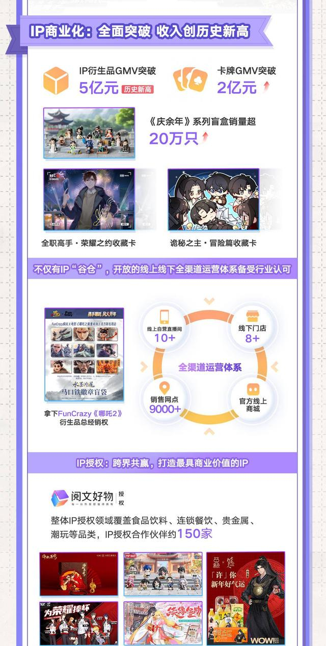 同时,阅文集团旗下IP衍生品厂牌阅文好物持续拓展自身渠道能力,覆盖十多家线上自营直播间、8家线下门店、淘宝、天猫等官方线上商城以及3000多家线上销售网点和6000多家线下销售网点,阅文好物还拿下FunCrazy疯玩《哪吒2》衍生品的国内总经销权。