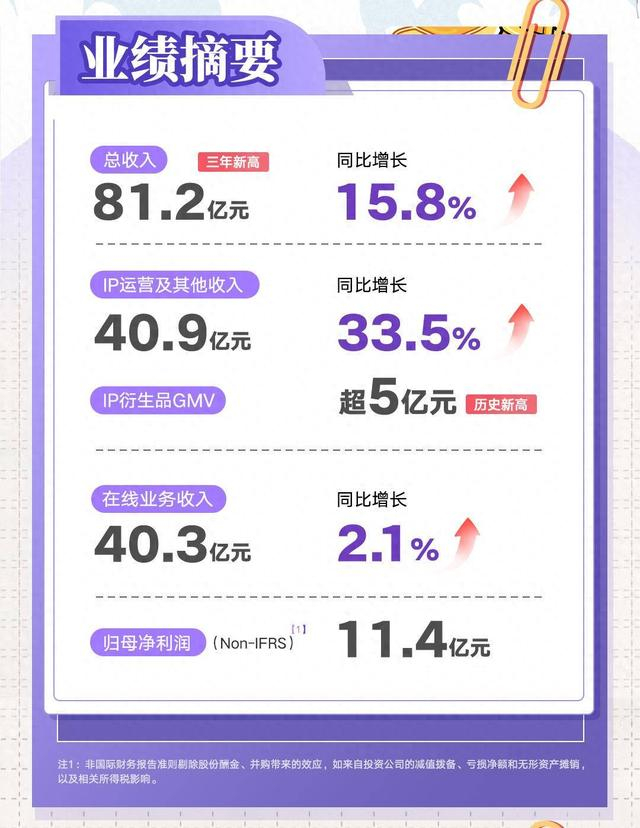 3月18日,阅文集团(股票代码:0772.HK)发布2024年全年业绩报告。公告显示,2024年阅文实现收入81.2亿元,同比增长15.8%,创三年内最高水平;特别是精品战略成效显著,一系列爆款内容不仅收获了口碑热度,也打开了IP商业化的巨大空间,IP版权收入同比大增34.2%,全产业链能力再上新台阶。阅文Non-IFRS归母净利润达11.4亿元,整体业绩表现稳健。