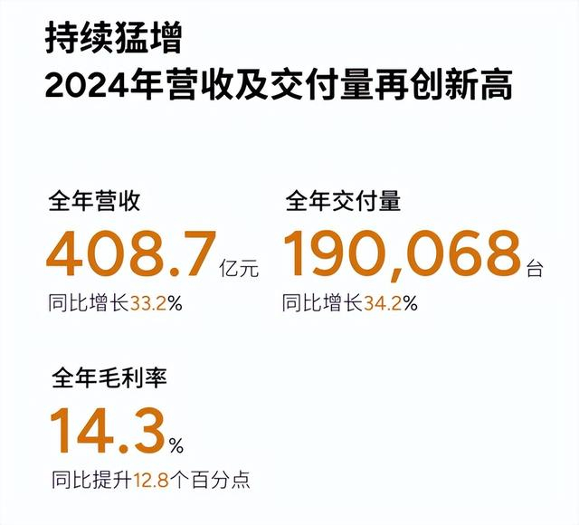 2024全年,小鹏汽车总收入达408.7亿元,按年上升33.2%;全年毛利率为14.3%,按年上升12.8个百分点。