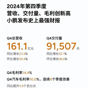 四季度,小鹏汽车总交付量为91,507辆,较2023年同期的60,158辆增长52.1%,创下单季度交付量历史新高,超过四季度87,000-91,000辆交付指引上限。