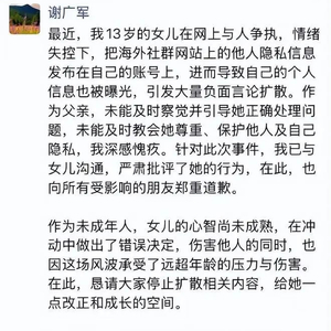 谢广军也就此事在朋友圈发文称,“最近,我13岁的女儿在网上与人争执,情绪失控下,把海外社群网站上的他人隐私信息发布在自己的账号上,进而导致自己的个人信息也被曝光,引发大量负面言论扩散。”