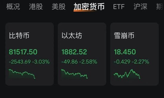 此外截至发稿,比特币跌超3%,跌破82000美元,此外,以太坊、狗狗币等虚拟货币也纷纷大跌。