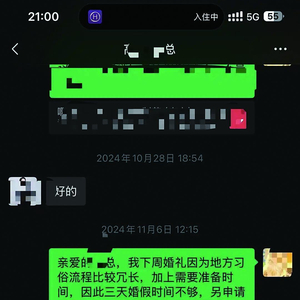 程女士告诉记者,公司人力资源部门(HR)解释,由于她的工作涉及频繁的技术交流,需要与客户和供应商对接,公司认为请假时间过长会导致岗位长时间缺人,因此拒绝了她7天连休的申请。无奈之下,程女士与丈夫协商后,决定调整结婚相关事宜的安排,缩短议程,重新申请了11月14日至11月15日的两天事假,最终通过。