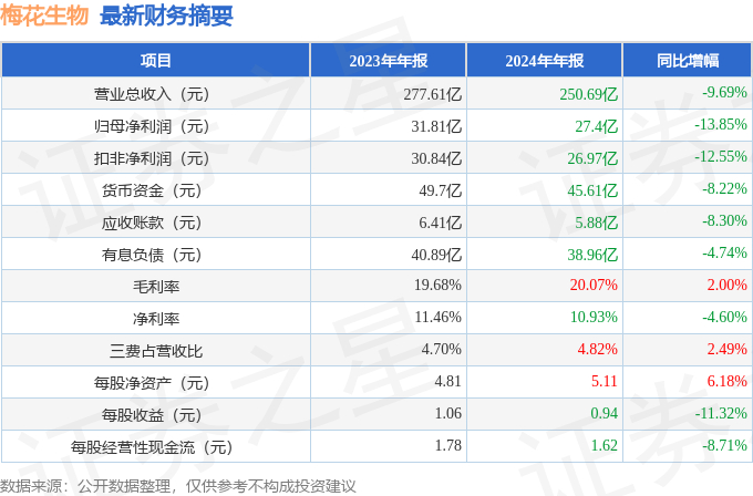 梅花生物2024年年报简析:净利润减13.85%