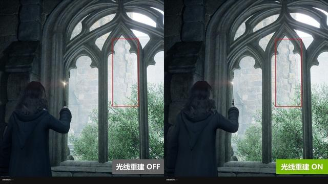 除此之外,光线重建能够修复一些画面的细节表现。比如下面对比截图中,开启光线重建后,红框部分的墙壁上的细节更加清晰,让建筑的光影层次更加分明。