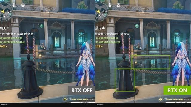 实机演示效果,开启光追后,效果较为明显的区域依然是水面,近处物体也能够吸收地面二次反射的光线,让轮廓更清晰。对面NPC在水中的倒影更清晰,且水面线与建筑的过渡更柔和。