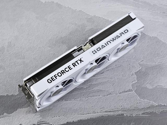 顶部是散热模组的出风口,整流罩侧面左侧是GEFORCE RTX字样,右侧是GAINWARD的信仰RGB灯效,点亮后呈现出炫彩效果,记得要搭配侧透的机箱。