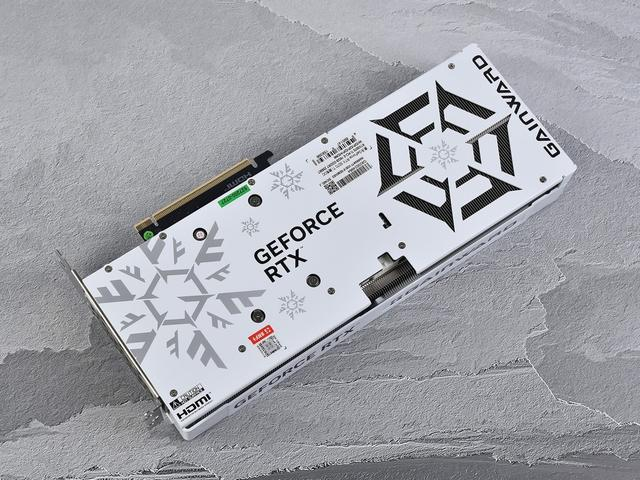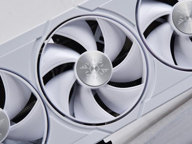 背部配备高强度背板,整体采用白色主视觉,左侧是灰色的雪花图案,右侧是大面积的雪花造型镂空,形成穿透式散热系统,配合散热器上第三组风扇的气流,直接穿透散热鳍片和PCB,进一步提升散热效率。