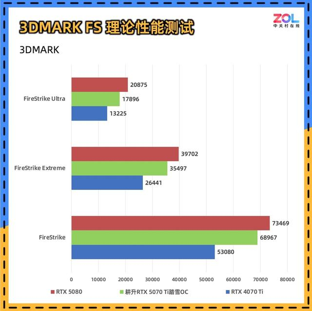 在针对DX12环境下的TimeSpy和TimeSpy Extreme测试中,耕升RTX 5070 Ti踏雪OC相较于RTX 4070 Ti,TS提升24%,TSE提升25%,综合提升约为25%。相比RTX 5080的差距为14%和16%,综合约为15%。