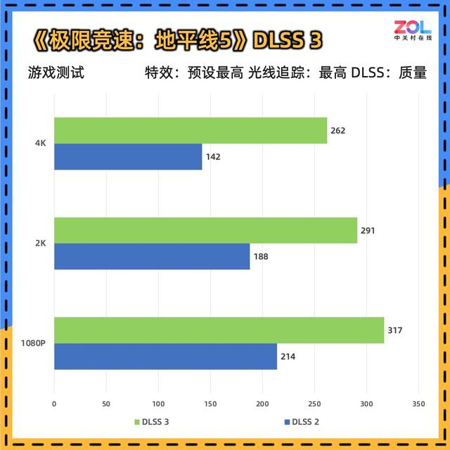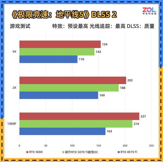 这款游戏是显卡测试的常客,其出色的优化在原生效果下即可跑出优秀的成绩。在4K分辨率下,耕升RTX 5070 Ti踏雪OC的DLSS 2成绩达到了142帧,DLSS 3成绩达到了262帧,这对于赛车游戏来说非常流畅。