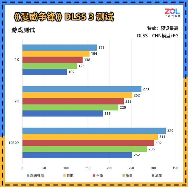加入DLSS 3帧生成的测试后,帧数进一步拉开,但在4K分辨率下的成绩,相较DLSS 2提升不如低分辨率下明显。
