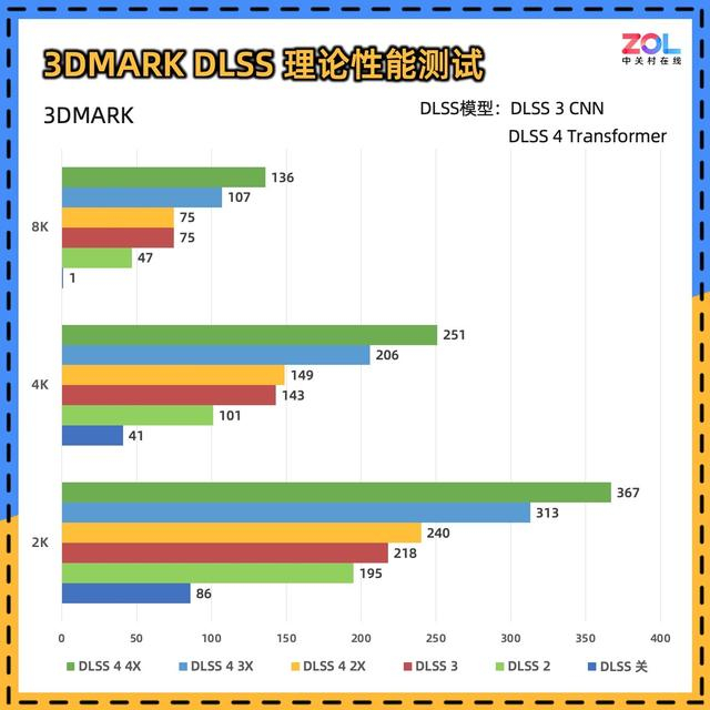 DLSS的理论测试变化较大,DLSS 2和DLSS 3采用上一代的CNN模型,而最新的多帧生成则采用了Transformer模型,并且多帧生成可调节生成帧的数量。从测试结果看,DLSS4 2X基本可以看作是DLSS 3的帧生成,而DLSS 4 4X模式相比DLSS 3,帧数综合提升在75%左右,其中8K分辨率提升高达81%左右,凭借DLSS 4的多帧生成达到136帧,8K高刷玩3A游戏不是梦。