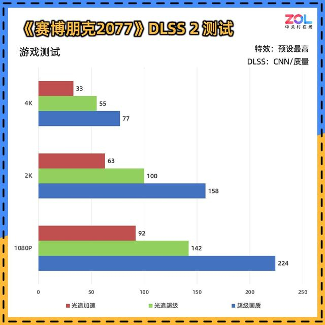 该游戏首发支持DLSS 4。我们测试不同DLSS设置下,显卡三档画质的帧数表现。为保证缩放比例固定,所有的测试均选择DLSS质量模式。先看使用CNN模型的DLSS 2,耕升RTX 5070 Ti踏雪OC在4K分辨率,光追超级画质为77帧,在光追加速模式为33帧。
