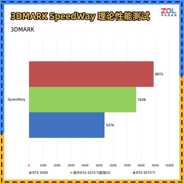SpeedWay结合了实时光线追踪和传统渲染技术,场景含有光线追踪反射、实时全局光照、网格着色器、体积照明、粒子和后处理效果,因此该项测试基本可以看做次世代3A游戏基准。经测试,耕升RTX 5070 Ti踏雪OC相对于RTX 4070 Ti提升了42%,新架构在次世代3A游戏中,面对光照、粒子等后处理效果提升非常巨大。
