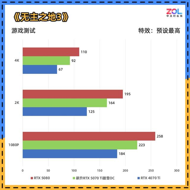 这款游戏相当经典,它能体现RTX 5070 Ti与RTX 4070 Ti以及RTX 5080的光栅化性能的综合差距。经实测,耕升RTX 5070 Ti踏雪OC相比RTX 4070 Ti,1080p提升21%,2K提升31%,4K提升37%,综合提升30%。