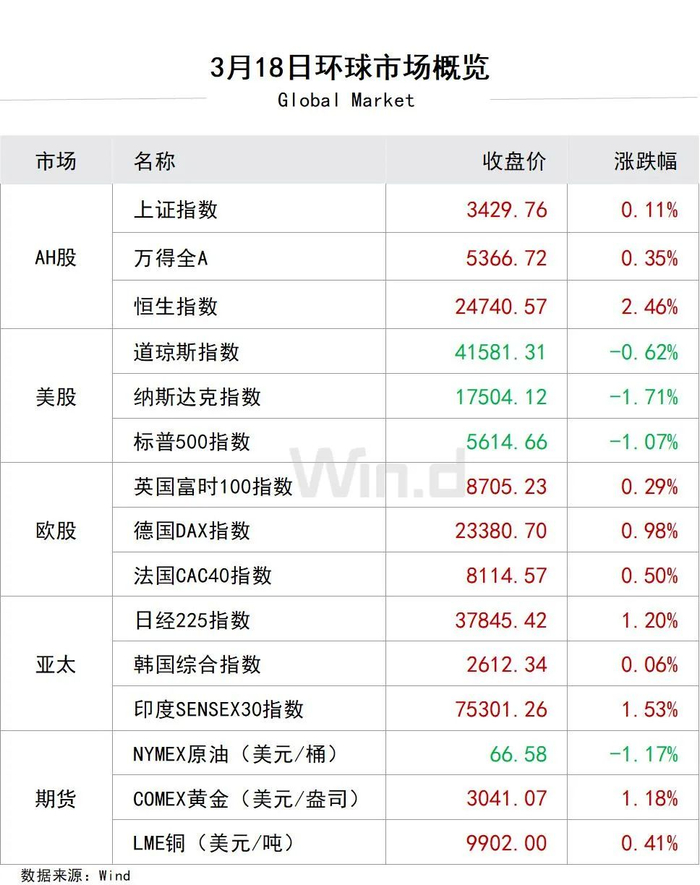 2、欧洲三大股指收盘全线上涨,德国DAX指数涨0.98%报23380.7点,法国CAC40指数涨0.5%报8114.57点,英国富时100指数涨0.29%报8705.23点。