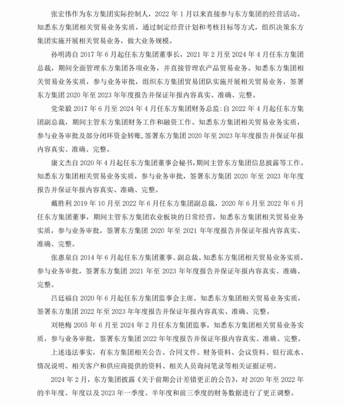 行政处罚事先告知书显示,2020年至2023年,东方集团出于维持农产品贸易市场占有率、满足融资需求以及业绩考核等目的,通过人为增加业务环节或虚构业务链条等方式,长期开展农产品融资性贸易和空转循环贸易。上述虚假销售业务导致东方集团2020年至2023年年度报告分别虚增营业收入约38.97亿元、48.65亿元、65.43亿元、8.25亿元,占各期对外披露营业收入(更正前,下同)的25.20%、32.05%、50.44%、13.56%,分别虚增营业成本约38.75亿元、48.44亿元、65.3亿元、8.24亿元,占各期对外披露营业成本的23.74%、29.57%、45.43%、11.45%。