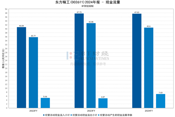 现金流量数据显示,经营活动现金流入2024年为47.63亿元,同比减少0.22%;现金流出为40.60亿元,同比减少5.27%,经营活动产生的现金流量净额为7.03亿元,同比增长44.21%,现金流改善主要因经营活动现金支出减少。投资活动现金流入16.24亿元,同比减少42.57%;现金流出21.65亿元,同比减少28.16%。筹资活动现金流入2.63亿元,同比减少69.36%;现金流出4.18亿元,同比减少45.60%。