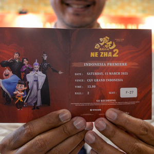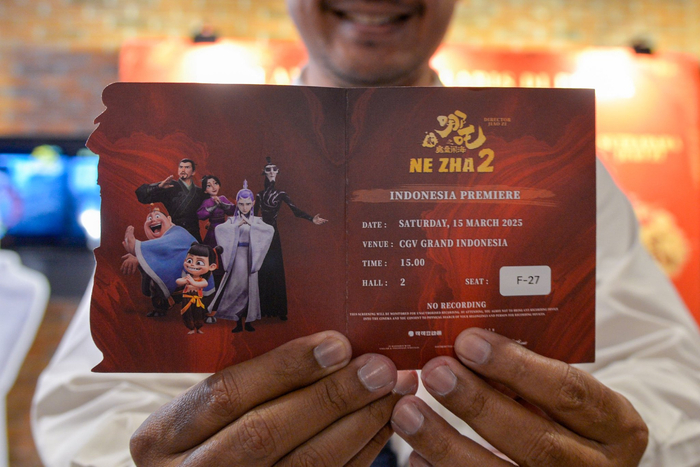3月15日,在印度尼西亚雅加达,一名参加《哪吒之魔童闹海》首映礼的观众展示电影票。(新华社)