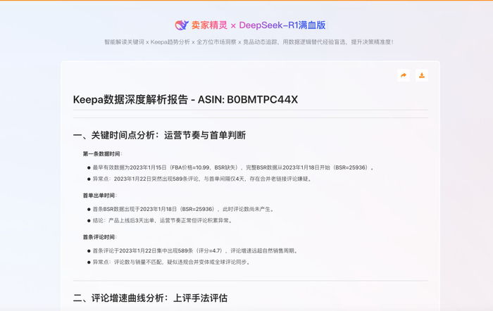 在产品创新方面,卖家精灵紧跟AI技术潮流,助力卖家品牌打造,更新了AI智能评论分析Listing生成器(接入DeppSeek模型)、全球商标库,外观专利查询功能。另外,在现场,卖家精灵产品经理Perin透露,卖家精灵AI Keepa数据分析已上线,正在内测中,后续也会陆续推出AI关键词解读报告、Al Listing分析、Al Listing对比、AI评论分析、AI外观专利分析、AI作图等功能,旨在利用AI+多场景的实际运用,实实在在帮助卖家提升效率。