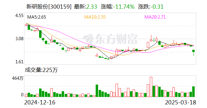 新研股份(300159)3月18日晚发布公告,因2024年度经审计的期末归母净资产为-2.71亿元,触及《深圳证券交易所创业板股票上市规则》财务类退市风险警示情形,公司股票自2025年3月20日起被实施退市风险警示,股票简称变更为“*ST新研”。