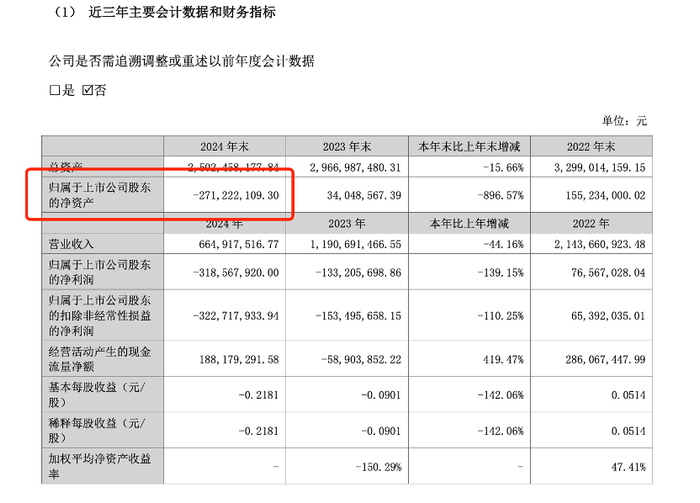 根据公告,新研股份2024年营业收入为6.65亿元,同比减少44.16%;归母净利润亏损3.19亿元,同比扩大139.15%;期末归母净资产为-2.71亿元,较2023年末的0.34亿元由正转负。