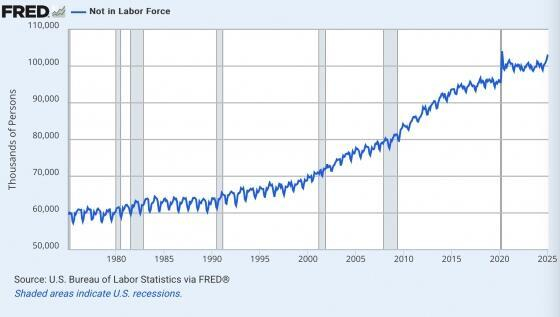 当美国成年人没有工作时,他们会被归入两个类别中的一个:多年来政府官僚将“官方失业”人数保持在低位,而“退出劳动力市场”人数则持续攀升。在金融危机期间,“官方失业”+“退出劳动力市场”总数都从未超过1亿。但如今,仅“退出劳动力市场人口”就超过了1.02亿!