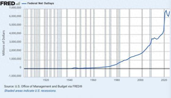 从下图可以看出,目前的联邦支出现在大约是1980年的14倍。与疫情前的最后一个完整年度相比,联邦支出每年大约高出了3万亿美元。虽然疫情平息后,联邦支出有所下降,但现在又开始呈指数级增长……