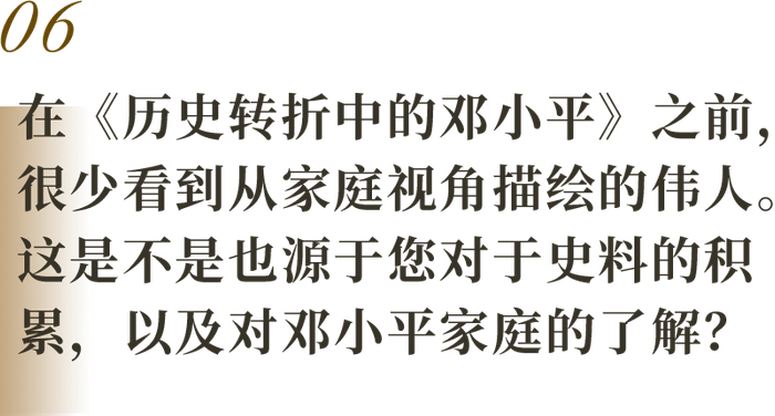 纪录片无非(依靠)两个东西,一个是影像资料,再一个就是采访。到(创作)纪录片《百年小平》的时候,因为资料已经都用过了,再想找新的资料就很难了,所以我跟闫东(总导演)商量,我们就干脆叫“口述历史”。采访了好几百人,大概用上了100多人。《百年小平》里面一个非常重要的特点,就是把(邓小平)家里面所有的人全部都采访了。因为我跟他们家人非常熟。最后就是以采访为主编的六集大型口述历史文献纪录片(备注:《百年小平》也是中国第一部口述历史纪录片)。