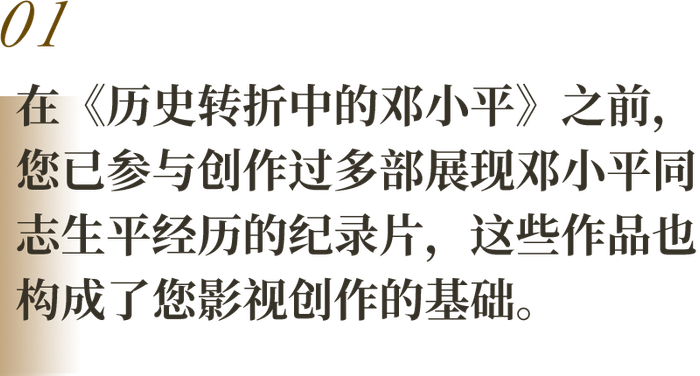 我最早参与的是12集文献纪录片《邓小平》,那是部经典,从1997年1月1号开始播,连播12天。2月19号,邓小平同志去世了,在治丧那个阶段所有的电视台又都在重播(这部纪录片)。大家也特别想看,不光是老百姓,包括当时的一些领导人,其实他们也没见过邓小平、也不了解邓小平,都是通过这个片子开始了解邓小平。12集、每集50分钟,那么大的篇幅把邓小平同志的一生做了介绍,而且是影像式的介绍,这真的是太震撼了。