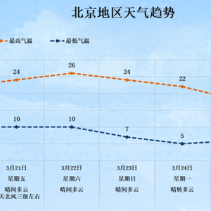 21日夜间:晴;偏北风二级左右;平原地区最低气温10℃,山区最低气温6~8℃。