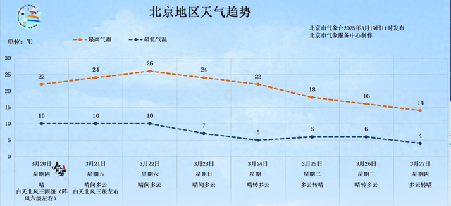 预计3月20日至27日,白天最高气温14~26℃,夜间最低气温 4~10℃。