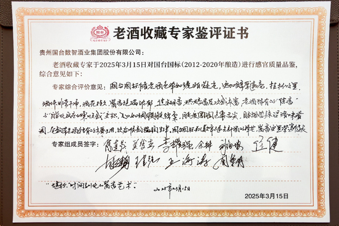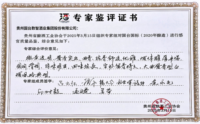 “酒体微黄透明,香气酱香、陈香、曲香都结合很好。酱香突出、酒体醇厚、香味协调,风味绵柔悠长。酒质量更上一个档次。”杨大金先生这样评价国台国标(2020年酿造)。