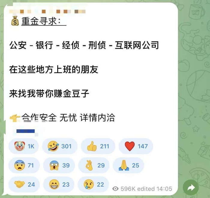 纷繁杂乱的群组信息中,还散布着寻求合作的广告帖。一则“重金寻求合作”的通知宣称“寻求与在公安、银行、经侦、刑侦、互联网公司等单位上班的人合作,来找我带你赚金豆子,合作安全、无忧、详情内洽”。