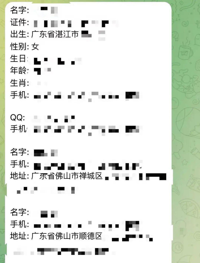 这种群组也被称为“社工库”,是黑灰产业从业者收集泄露的个人信息搭建的数据库。记者看到,单个群组内多则28万人,少则数千人。短短一个小时内,便有数百位网民提供名字或手机号,进行“开盒”。上千条个人隐私信息由机器人自动回复,暴露在群组中,包括QQ号、手机IMEI、所在城市等基础信息。