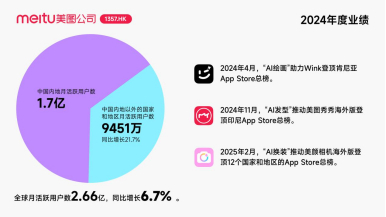 截至2024年12月31日,美图公司全球月活跃用户数达到2.66亿,同比增长约6.7%。其中,中国内地以外的国家和地区月活跃用户数为9451万,同比增长约21.7%,占整体月活跃用户数的35.6%。