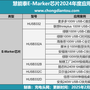 现阶段,百瓦级别快充数据线必须内置E-marker芯片,此类芯片携带着线缆的属性信息,可以与设备相互通信,标记线缆的各种属性,从而在使用过程中防止出现问题。这一芯片的引入为线材质量和功能提供了更可靠的保证,也为消费者提供了更好的使用体验。而慧能泰作为深耕USB-C生态链电源芯片的企业,不断紧随市场需求,推出HSB332、HUSB332A、HUSB332B,HUSB332C, HUSB332D, HUSB332E, HUSB332F, HUSB332G等一系列E-marker芯片,满足100-240W快充数据线应用需求。