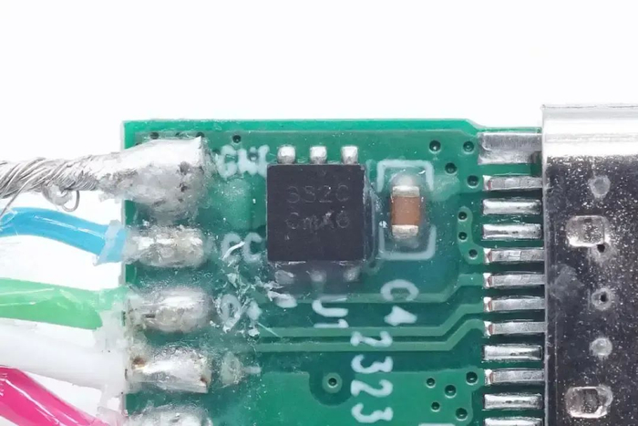 丝印332A的芯片为慧能泰HUSB332A,这是一颗E-Marker芯片,同时支持PD2.0、PD3.0、USB4、雷电3以及USB PD3.1 EPR扩展功率范围。芯片已经通过了USB-IF协会认证,TID号:4324。