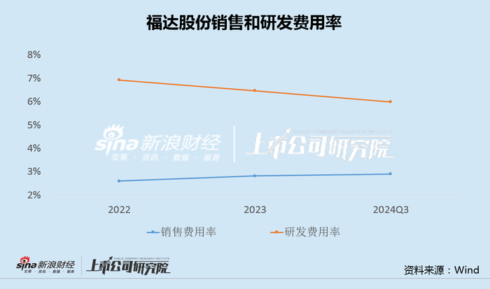 然而,令人不解的是,从传统汽车零部件到新能源汽车零部件再到机器人零部件,连续开拓新业务领域的同时,福达股份的研发费用率却不断下滑,销售费用率反而逐年上升。