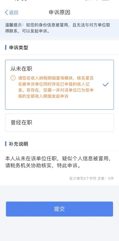 当您发现您的任职受雇信息、收入纳税明细信息、办税权限与实际不相符时,可以就不属实的信息发起申诉。