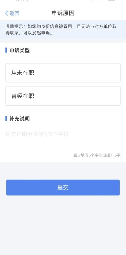 2. 填写补充说明(至少填写5个字符),如果申诉类型为【曾经在职】,需要补充说明离职时间。点击【提交】按钮,提交申诉。