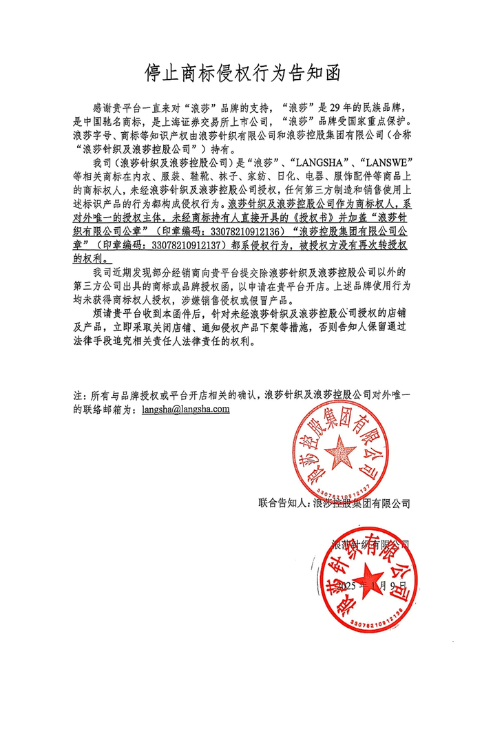 2025年1月9日,浪莎在官网贴出发给某平台的停止商标侵权行为告知函,提到发现部分经销商向平台提交除浪莎以外第三方公司出具的商标或品牌授权函,以申请开店。该行为未获得商标权人授权,涉嫌销售侵权或假冒产品。