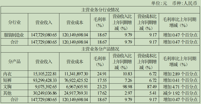 根据年报披露,浪莎股份主要研发、生产和经营各种保暖内衣、时尚内衣、短裤、文胸等针织服装,以及外贸服装的贴牌加工。