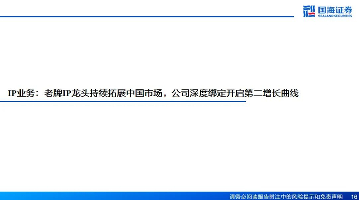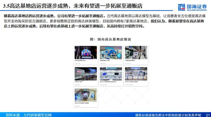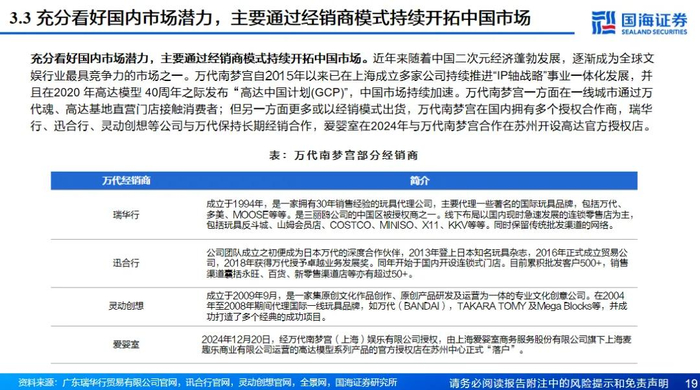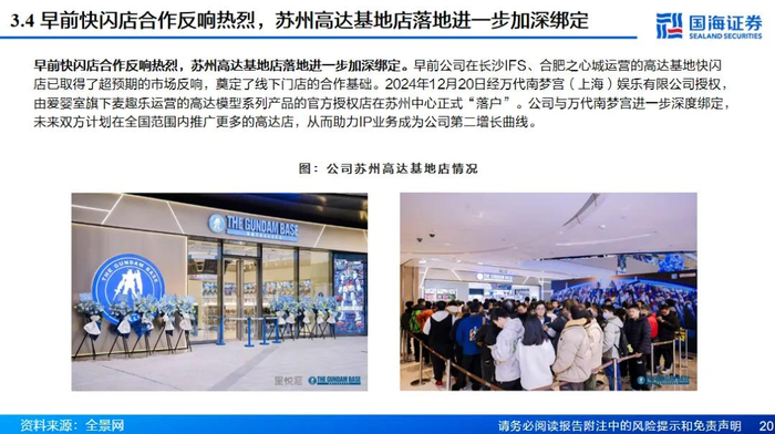 老牌IP龙头持续拓展中国市场,公司深度绑定IP业务有望成为第二增长曲线。IP消费逐步崛起,万代南梦宫作为世界头部IP集团,拥有高达、龙珠等400多个知名IP,是利润超千亿日元且仍快速增长的IP龙头。万代南梦宫充分看好中国市场潜力,一方面在一线城市通过万代魂、高达基地直营门店接触消费者;但更多以经销模式出货,万代南梦宫在国内拥有多个授权合作商。爱婴室作为中国区头部经销商与万代南梦宫深度绑定,目前已于苏州开业高达基地店,已取得了超预期的市场反响,在除超一线城市以外的全国区域内开店数量增长空间较大。此外,除高达基地店以外的其余万代通贩店、线上业务等渠道类型合作均是待开发的空白领域。