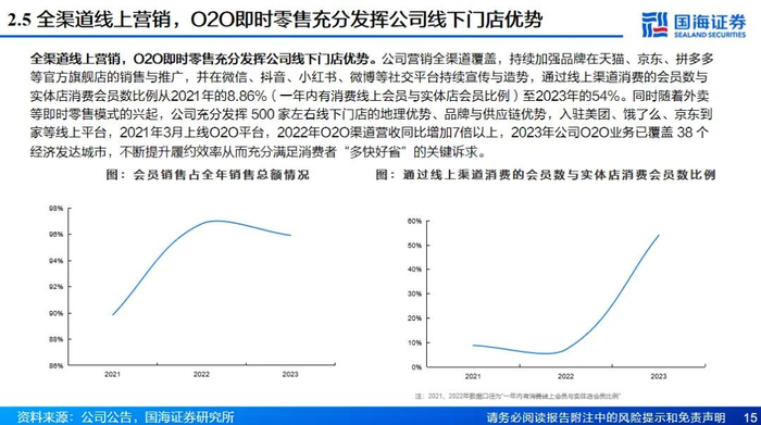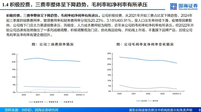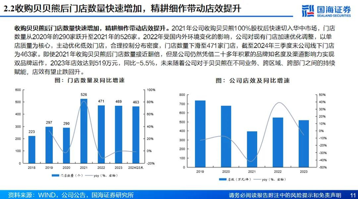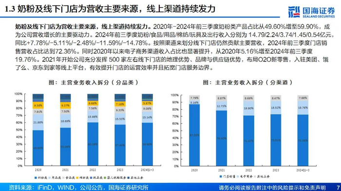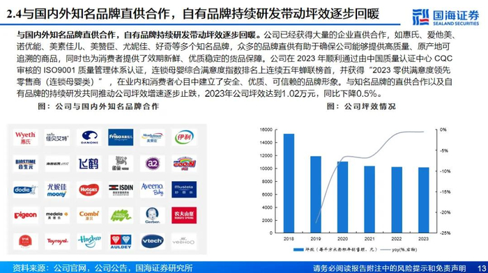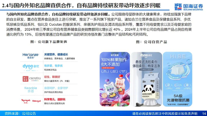 三胎政策春风下,母婴主业渠道产品齐发力。虽然我国人口增长进入缓慢阶段,但是未来随着三胎政策及生育制度的进一步完善,母婴市场仍然具有较大韧性和增长潜力。在渠道方面,公司通过收购贝贝熊实现门店数量的快速提升,未来或将继续积极拓店,并且削减门店面积实现店效的持续提升;另一方面公司线上全营销渠道覆盖,通过O2O将线下门店优势与线上平台相结合。在产品方面,公司与国内外知名品牌进行直供合作,截至2023年连锁母婴综合满意度指数排名上连续五年蝉联榜首,并且公司自营品牌持续突破, 2024年上半年公司自有品牌产品占到自有渠道比例约为13%,后续有望通过自有品牌产品的研发持续改善门店整体产品结构和毛利结构。