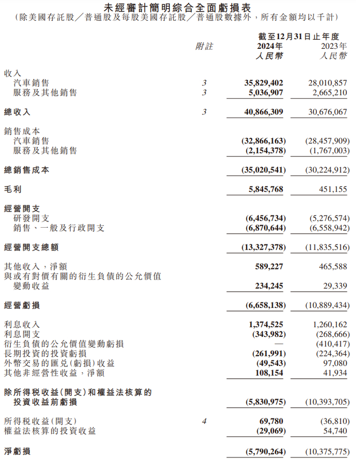 财报显示,2024年小鹏汽车总收入为人民币408.7亿元,较2023年的306.8亿元上升33.2%。相比2023年的14.23%有显著增加。其中汽车销售收入为358.3亿元,同比上升27.9%,主要因交付量增加。