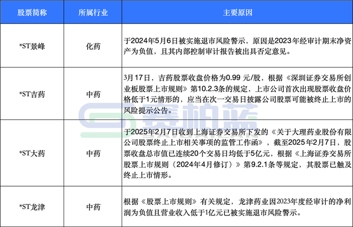 梳理发现,目前已经有不少药企股票触及终止上市的情形,包括*ST吉药、*ST大药等。
