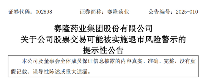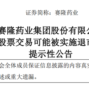 3月15日,赛隆药业发布《关于公司股票交易可能被实施退市风险警示的提示性公告》 。