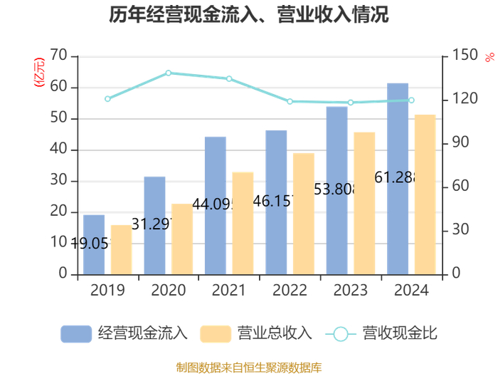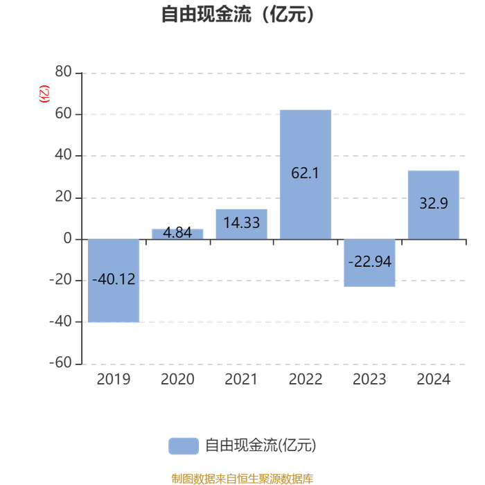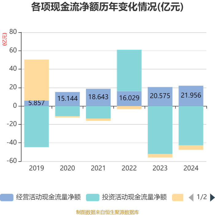 截至2024年,公司经营活动现金流净额为21.96亿元,同比增长6.71%;筹资活动现金流净额-5.01亿元,同比减少1.16亿元;投资活动现金流净额-42.74亿元,上年同期为-52.1亿元。