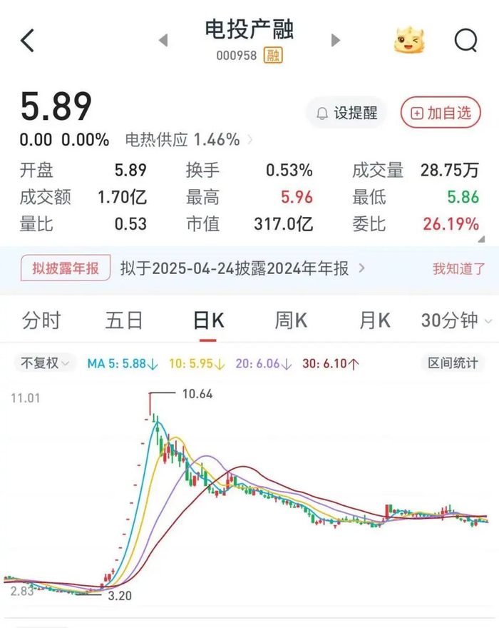 截至3月19日收盘,电投产融报5.89元/股,总市值为317亿元。